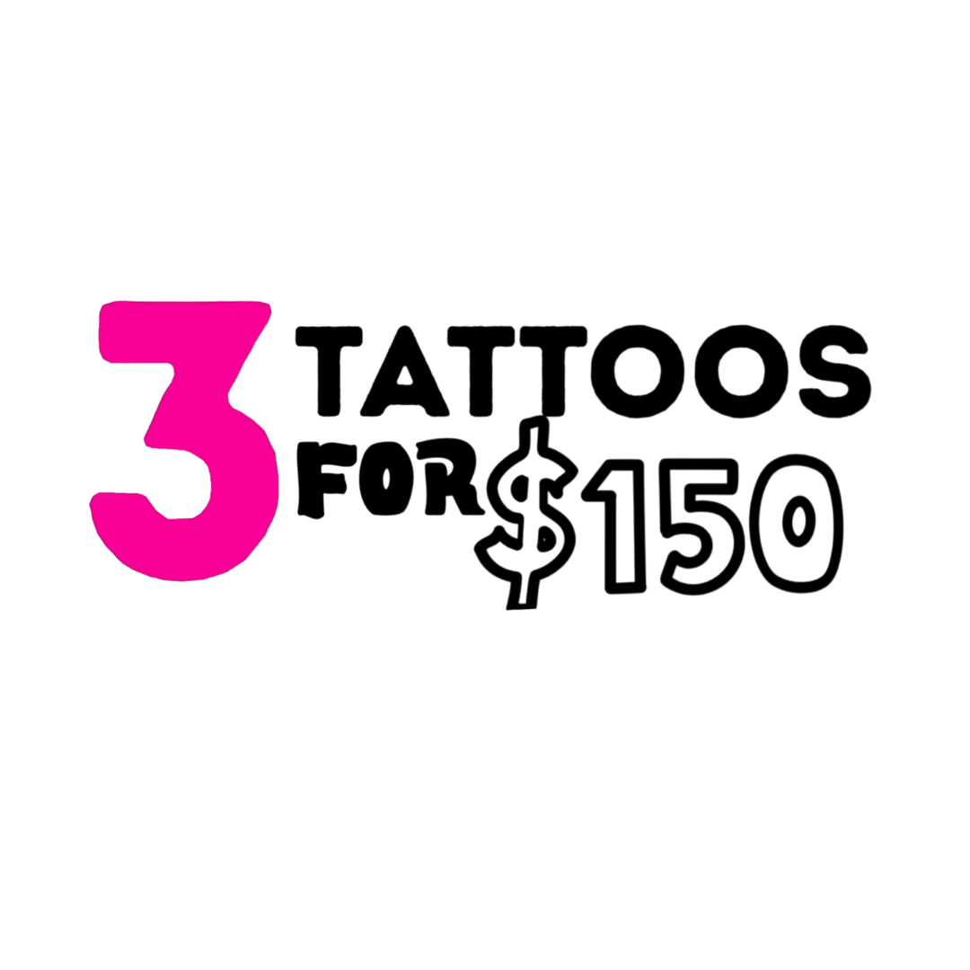 RULES: ALL 3 TATTOOS MUST TO BE DONE ON THE SAME PERSON AND AT SAME TIME / MAX size: 1.5 inches / BLACK INK ONLY colour can be add for +$20 / SCRIPTS WITH THREE WORDS MAX / FLASH OR CUSTOM